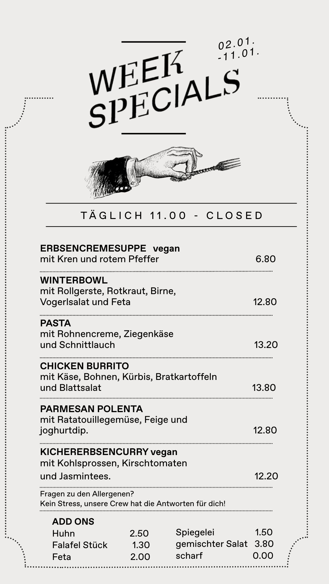 Klagenfurt schließt nicht um neun! Ab vier haben wir ausgewählte Speisen bis in die Nacht. Nach dem Kino, nach dem Theater, nach dem Bier, beim ersten Heißhunger.